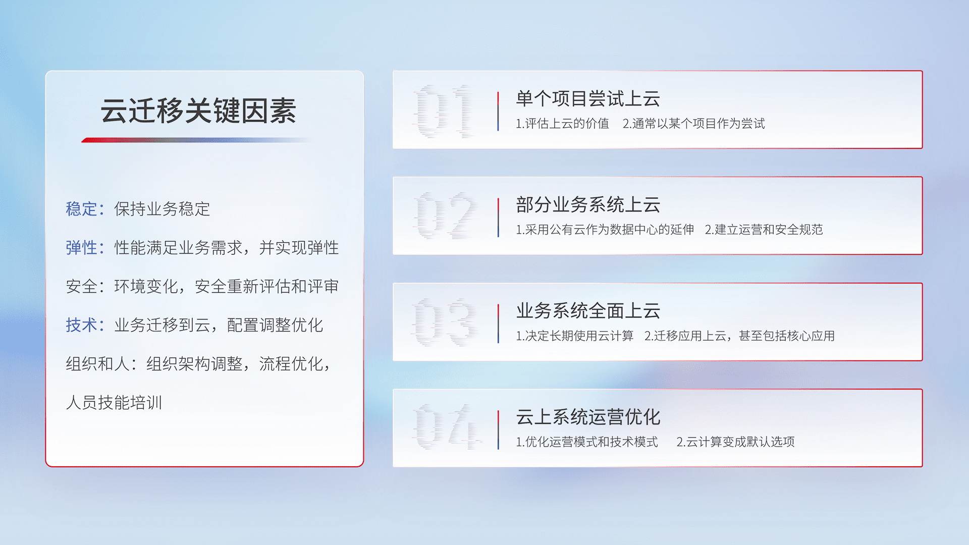 结合实际业务,,从规划设计、、、、云平台选型、、云原生改造、、、数据迁移、、集成交付,,,,迁移全过程为客户识别最佳上云路径,,,,做好风险识别管理,,,,设计网络架构、、身份权限、、、、安全审计合规、、操作审计、、、日志审计、、、、监控告警策略、、多站点容灾设计等,,对云上基础设施进行整体规划,,提升IT治理水平,,,,以满足弹性、、、、高可用、、、、高性能的需求。。。。